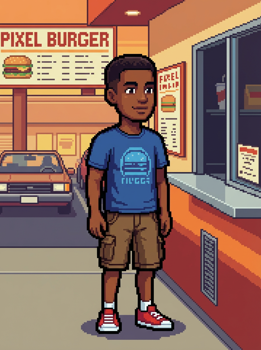 model as pixel art character in casual pixel style, at pixelated drive-thru restaurant, wearing pixel graphic tee, cargo shorts, sneakers, fast food pixel art setting, nostalgic americana pixel style