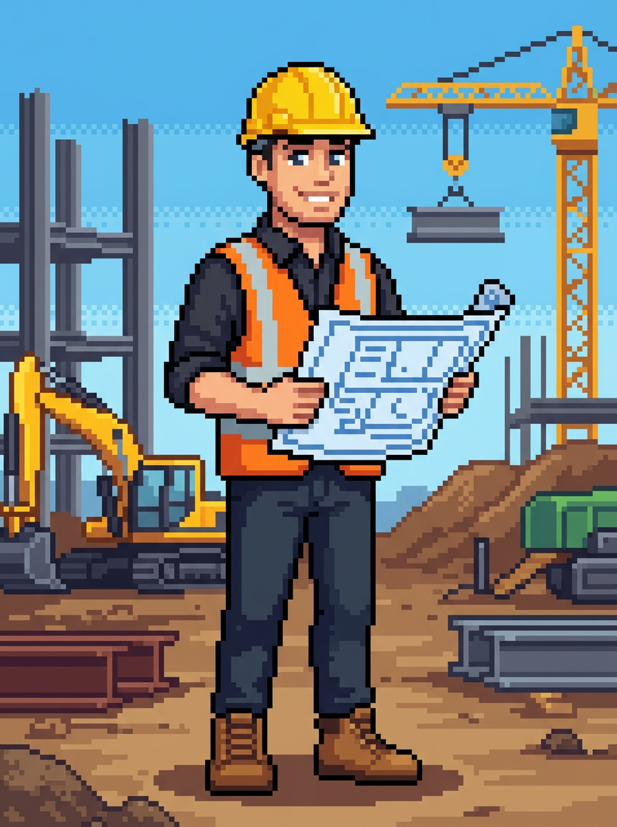 model as pixel art character in construction pixel style, at pixelated construction site, wearing hard hat, safety pixel vest, work boots, industrial pixel art, construction equipment in pixel form