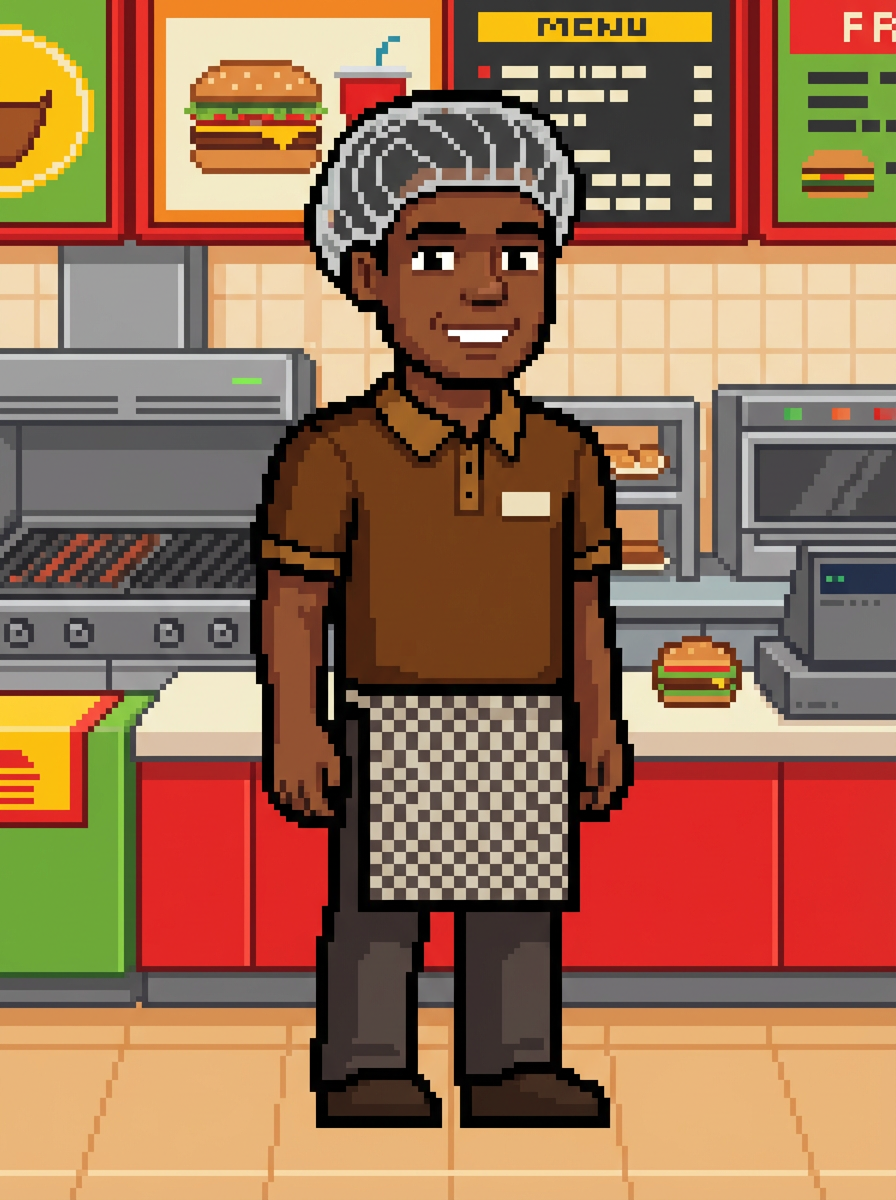 model as pixel art character in food service pixel style, in pixelated fast food kitchen, wearing uniform, hair net, pixel apron, restaurant kitchen pixel art, food service pixel aesthetic