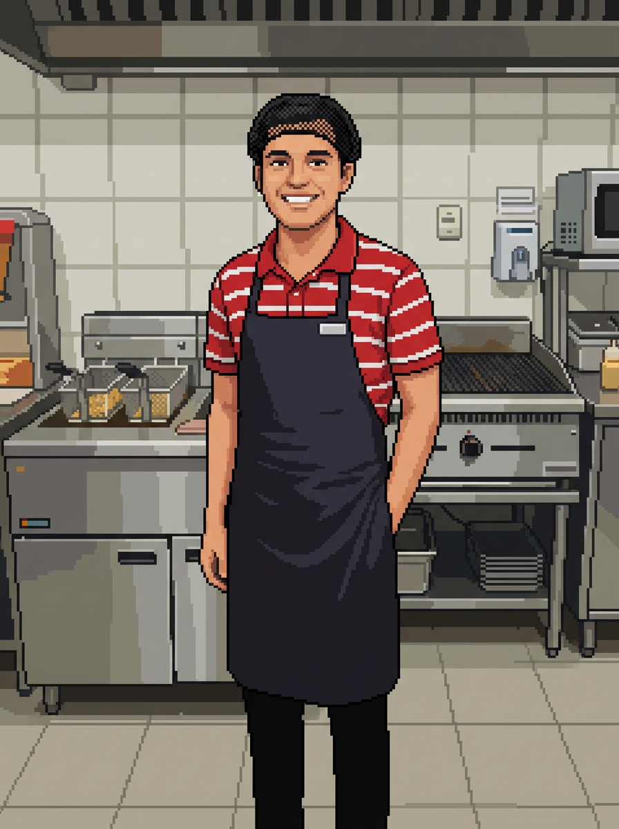 model as pixel art character in food service pixel style, in pixelated fast food kitchen, wearing uniform, hair net, pixel apron, restaurant kitchen pixel art, food service pixel aesthetic