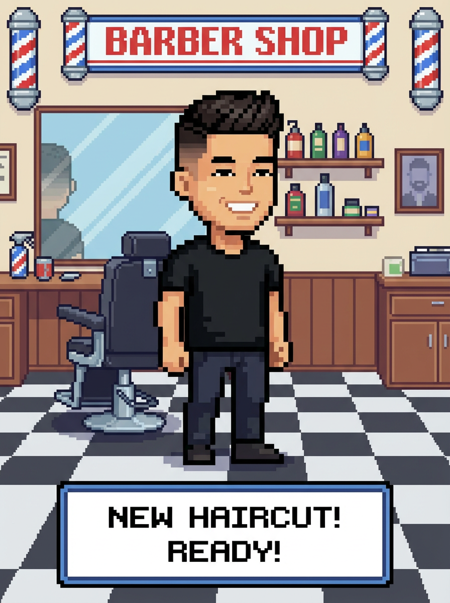 model as pixel art character in grooming pixel style, in pixelated barber shop, wearing fresh haircut, casual pixel clothes, classic barber shop pixel art, retro grooming pixel style