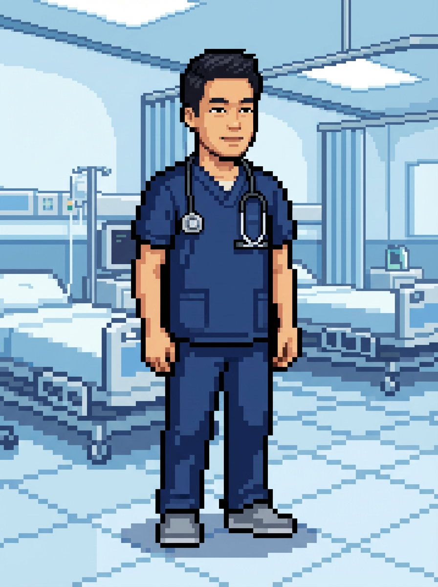 model as pixel art character in medical pixel style, in pixelated hospital, wearing medical pixel scrubs, stethoscope, comfortable shoes, healthcare pixel art setting, clean medical pixel aesthetic