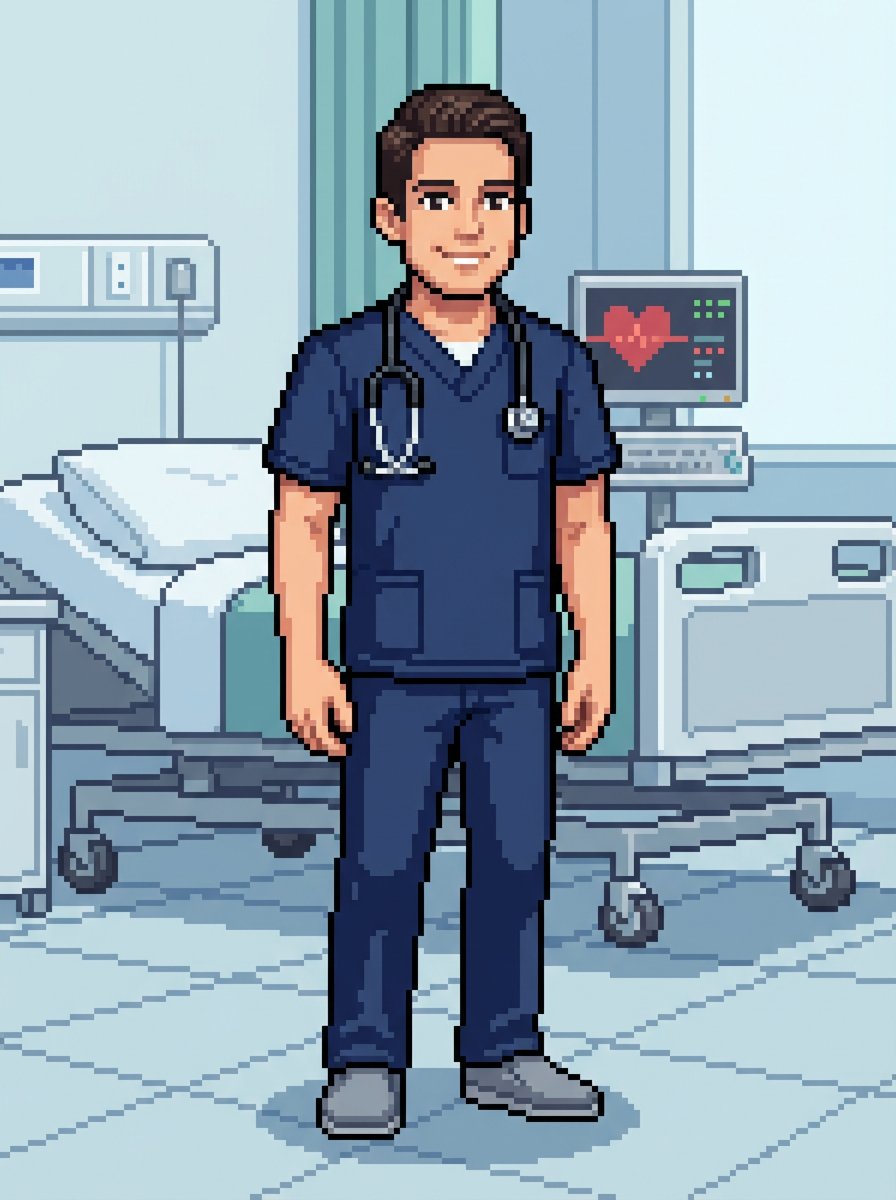 model as pixel art character in medical pixel style, in pixelated hospital, wearing medical pixel scrubs, stethoscope, comfortable shoes, healthcare pixel art setting, clean medical pixel aesthetic