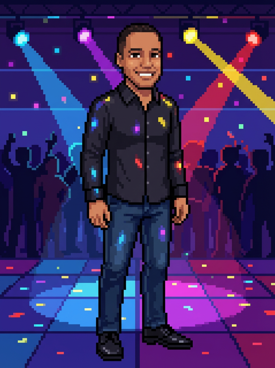 model as pixel art character in nightlife pixel style, at pixelated nightclub dance floor, wearing club pixel shirt, dark jeans, dress shoes, disco pixel art lighting, retro club atmosphere
