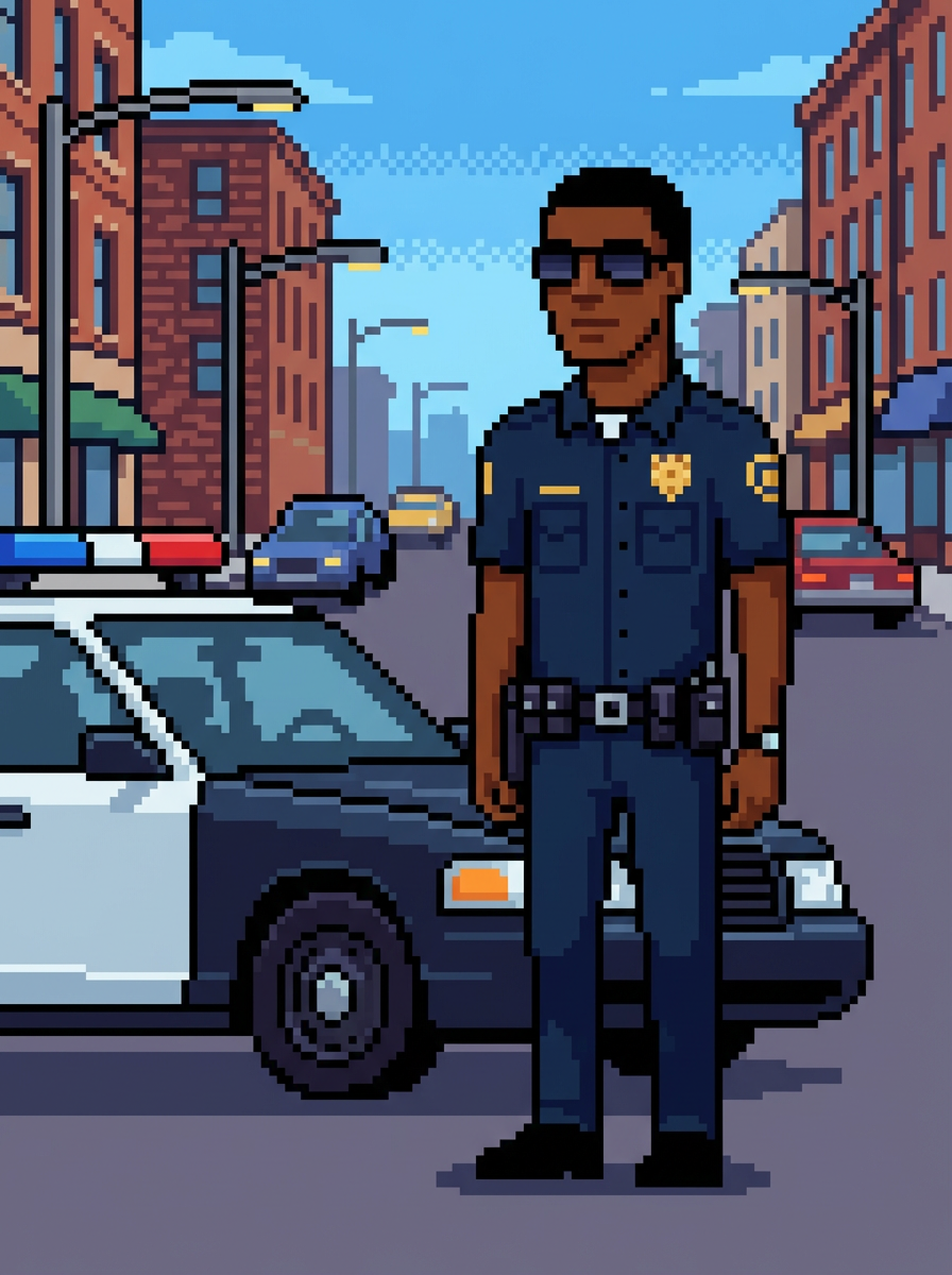 model as pixel art character in police pixel uniform, next to pixelated police car in downtown pixel city, wearing pixel police uniform, badge, utility belt, sunglasses, classic beat cop pixel art style