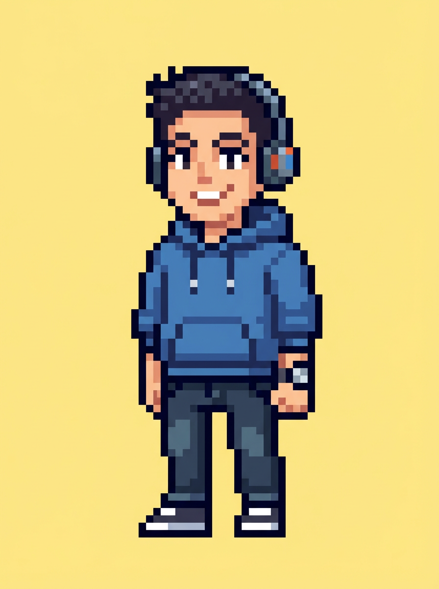 model as pixel art character in social media avatar style, wearing stylish pixel hoodie, clean jeans, cool accessories, solid color pixel background, clean minimalist pixel art style, optimized for social media profile use, crisp pixel details, modern avatar aesthetic