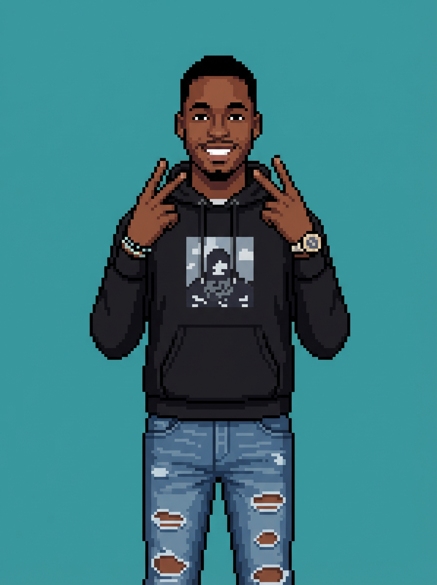 model as pixel art character in social media avatar style, wearing stylish pixel hoodie, clean jeans, cool accessories, solid color pixel background, clean minimalist pixel art style, optimized for social media profile use, crisp pixel details, modern avatar aesthetic