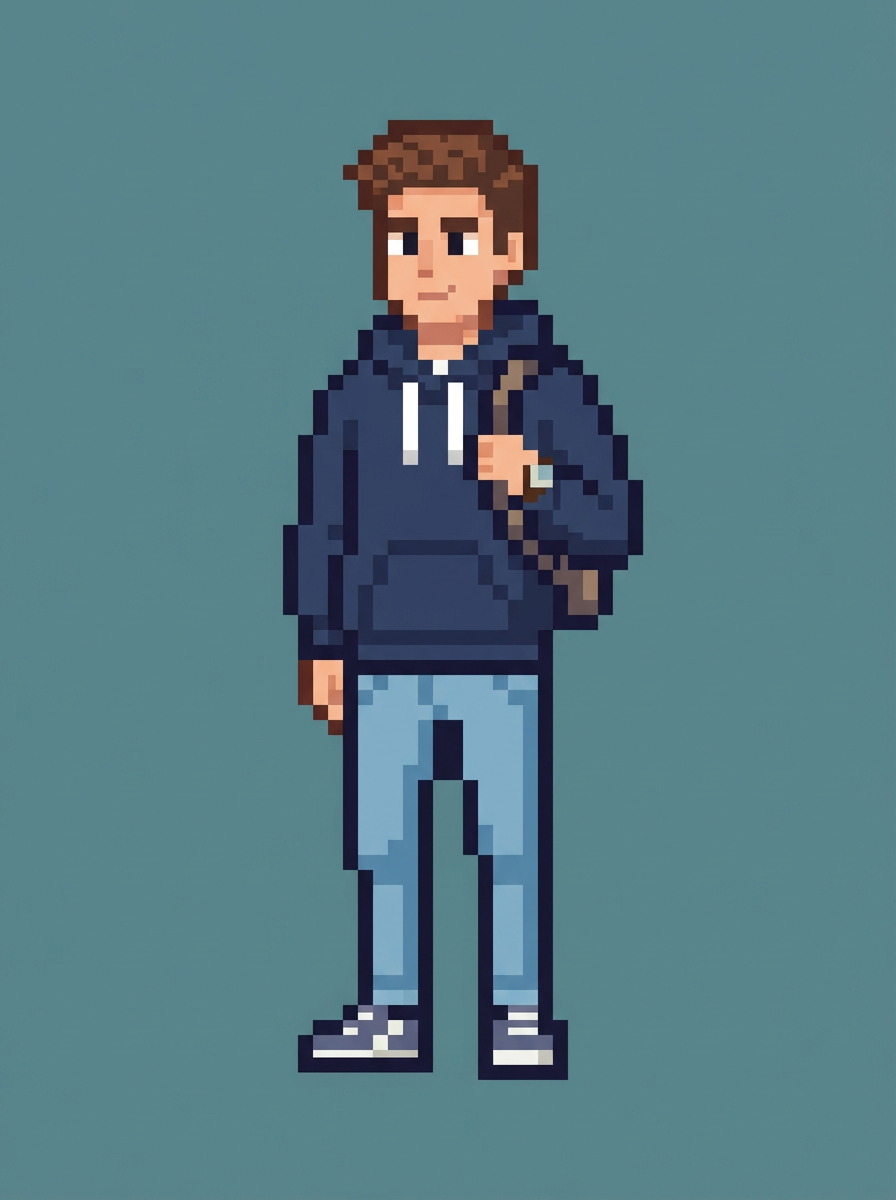 model as pixel art character in social media avatar style, wearing stylish pixel hoodie, clean jeans, cool accessories, solid color pixel background, clean minimalist pixel art style, optimized for social media profile use, crisp pixel details, modern avatar aesthetic