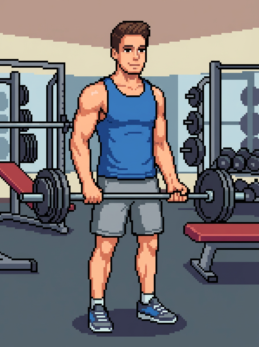 model as pixel art character in sports pixel style, in pixelated gym working out, wearing pixel tank top, shorts, sneakers, retro fitness pixel art, classic gym equipment in pixel form