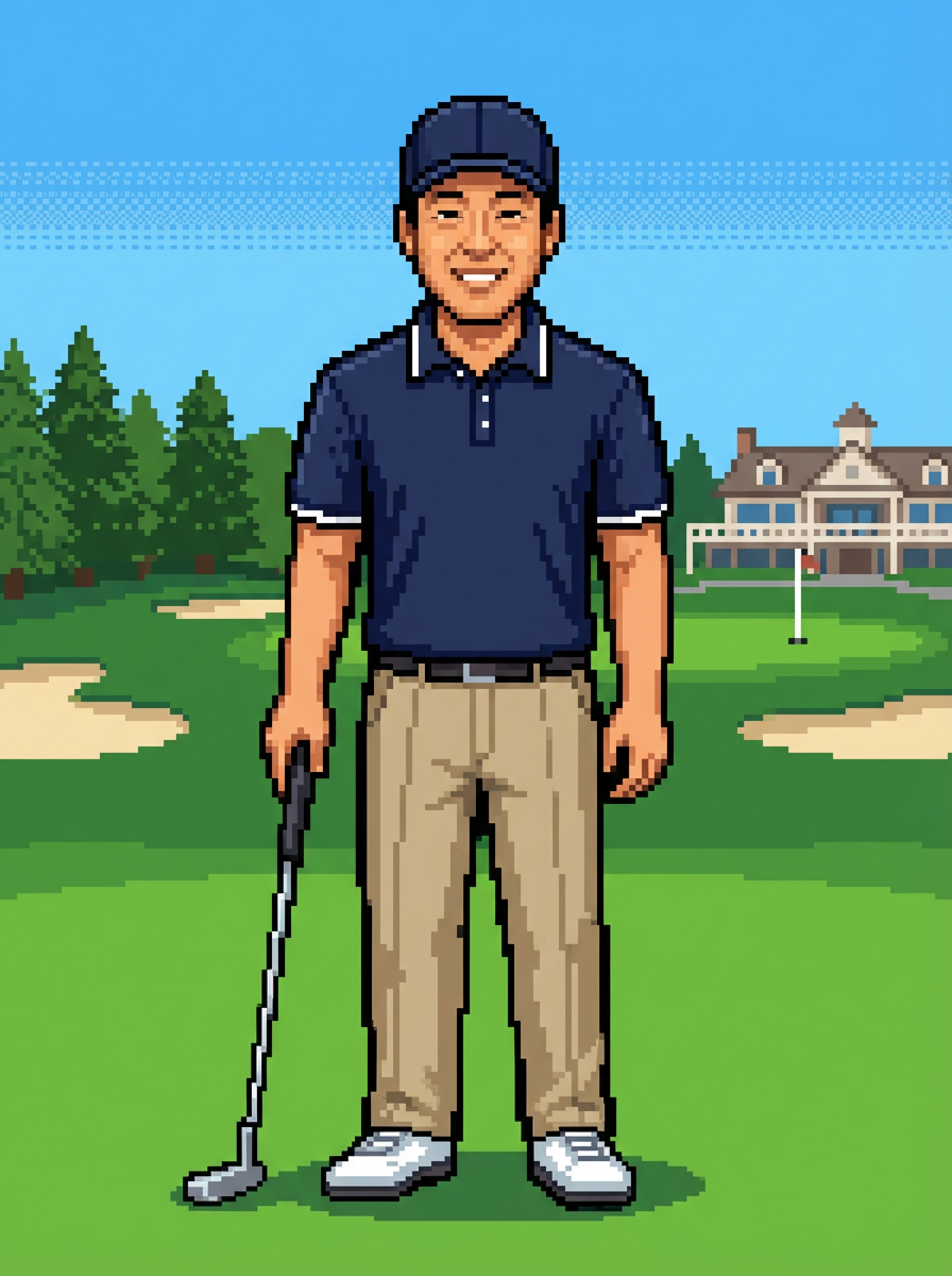model as pixel art character in sports pixel style, on pixelated golf course, wearing polo pixel shirt, khaki pants, golf cap, country club pixel art, green golf course in pixel form