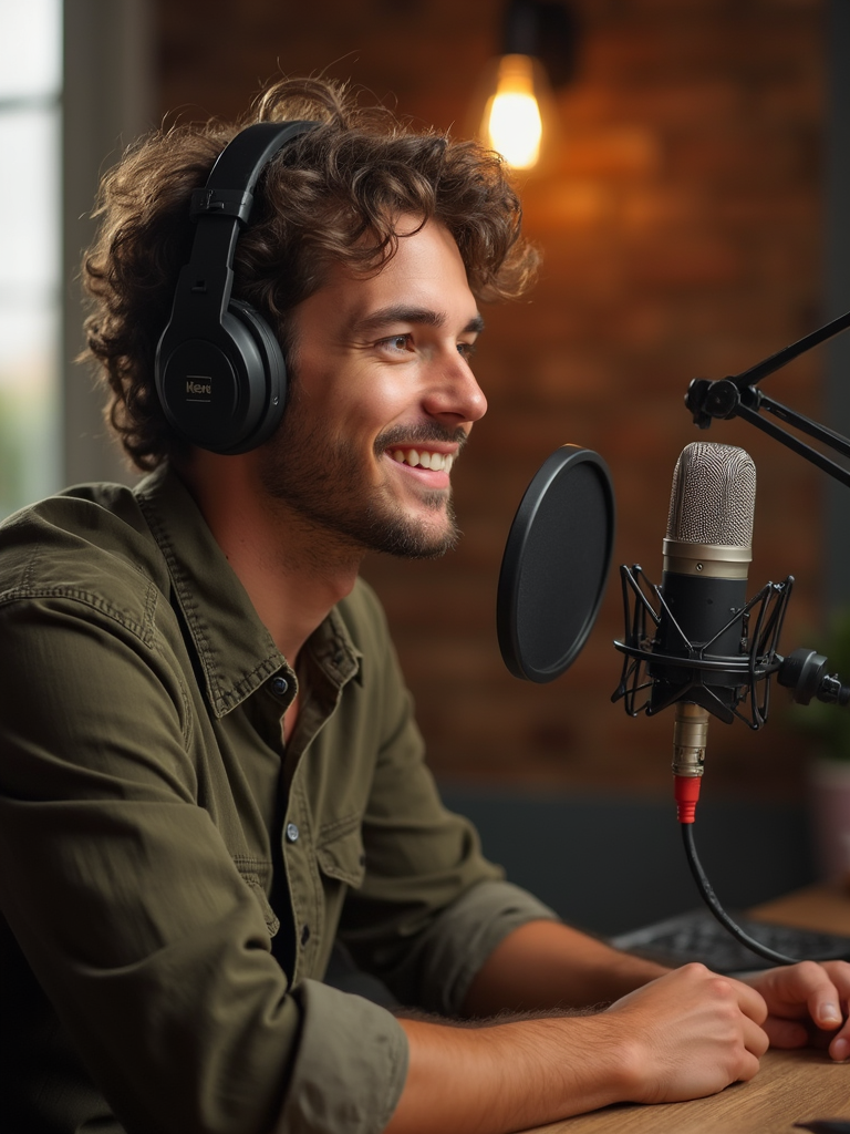 model as podcast co-host, wearing relaxed button-up, sharing microphone space, collaborative setup, warm studio atmosphere, friendly interaction
