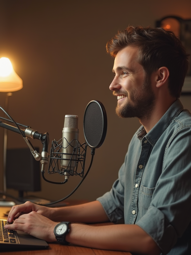 model as podcast co-host, wearing relaxed button-up, sharing microphone space, collaborative setup, warm studio atmosphere, friendly interaction