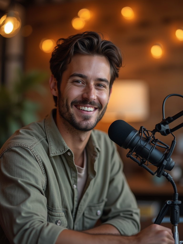model as podcast co-host, wearing relaxed button-up, sharing microphone space, collaborative setup, warm studio atmosphere, friendly interaction