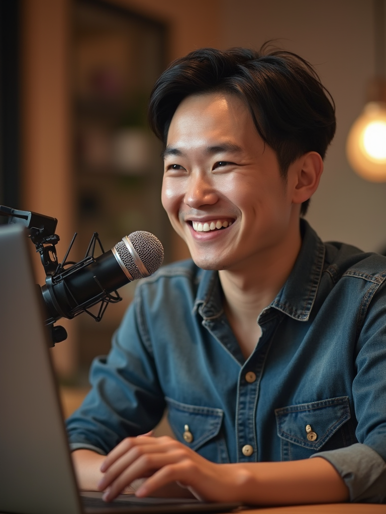 model as podcast co-host, wearing relaxed button-up, sharing microphone space, collaborative setup, warm studio atmosphere, friendly interaction