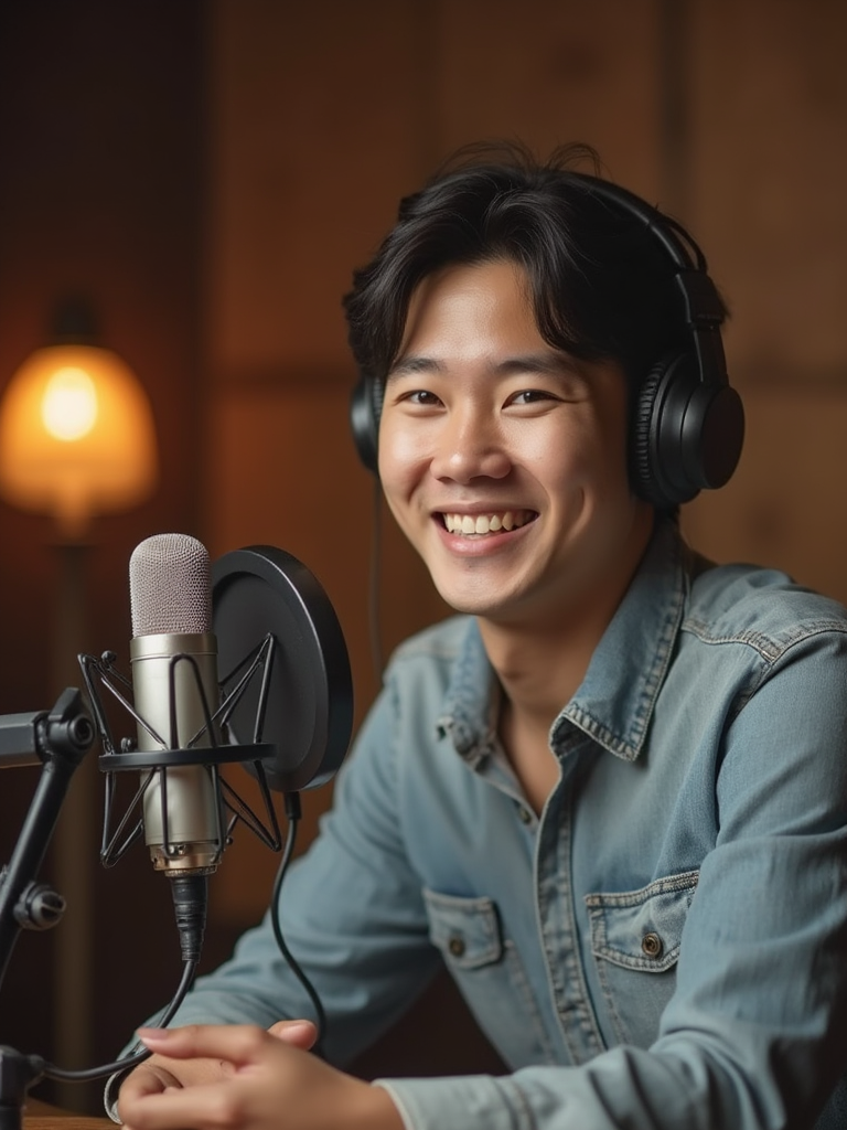 model as podcast co-host, wearing relaxed button-up, sharing microphone space, collaborative setup, warm studio atmosphere, friendly interaction