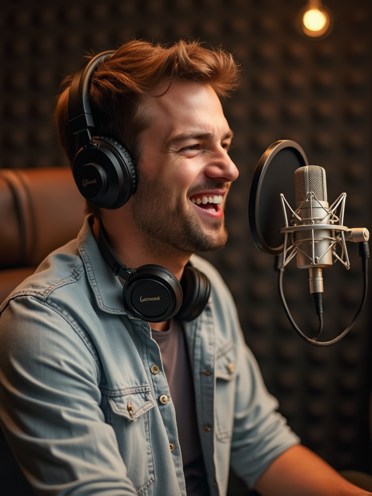 model as podcast host in professional studio, wearing smart casual button-up shirt, speaking into boom microphone, headphones around neck, warm studio lighting, confident expression
