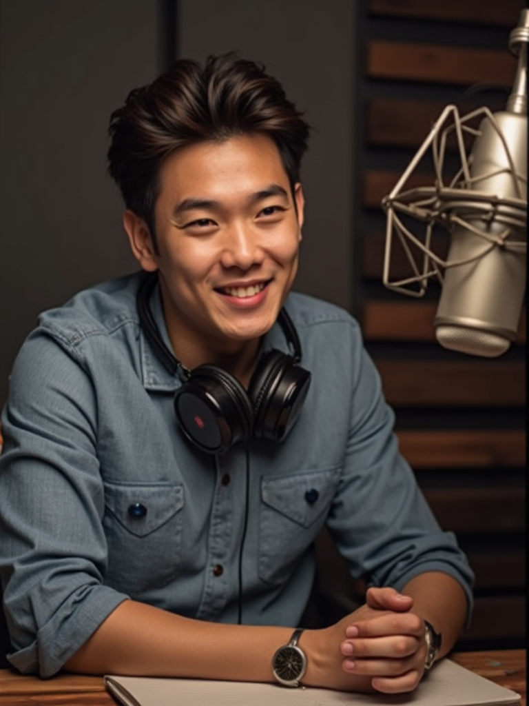 model as podcast host in professional studio, wearing smart casual button-up shirt, speaking into boom microphone, headphones around neck, warm studio lighting, confident expression