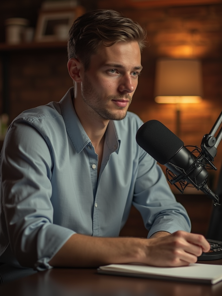 model as podcast interviewer, wearing crisp dress shirt, leaning toward microphone, notepad visible, intimate conversation setup, warm lighting