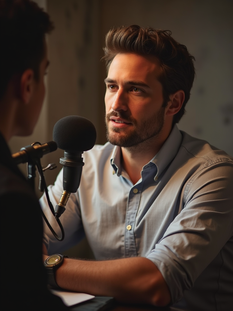 model as podcast interviewer, wearing crisp dress shirt, leaning toward microphone, notepad visible, intimate conversation setup, warm lighting