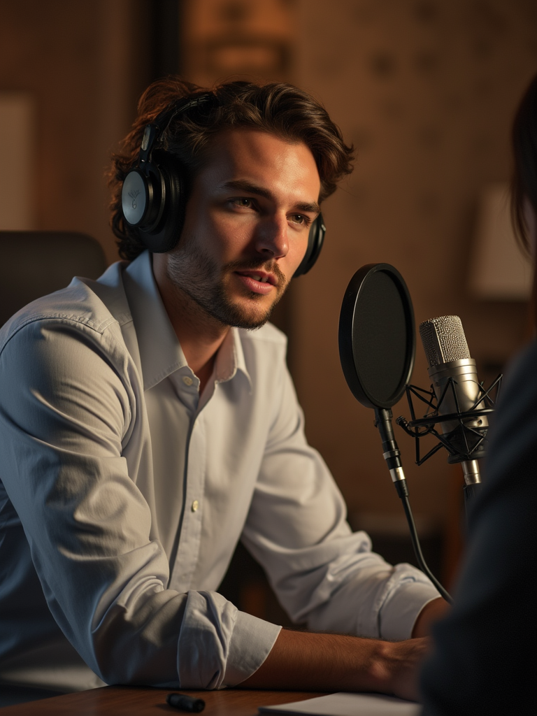 model as podcast interviewer, wearing crisp dress shirt, leaning toward microphone, notepad visible, intimate conversation setup, warm lighting