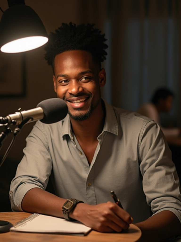 model as podcast interviewer, wearing crisp dress shirt, leaning toward microphone, notepad visible, intimate conversation setup, warm lighting