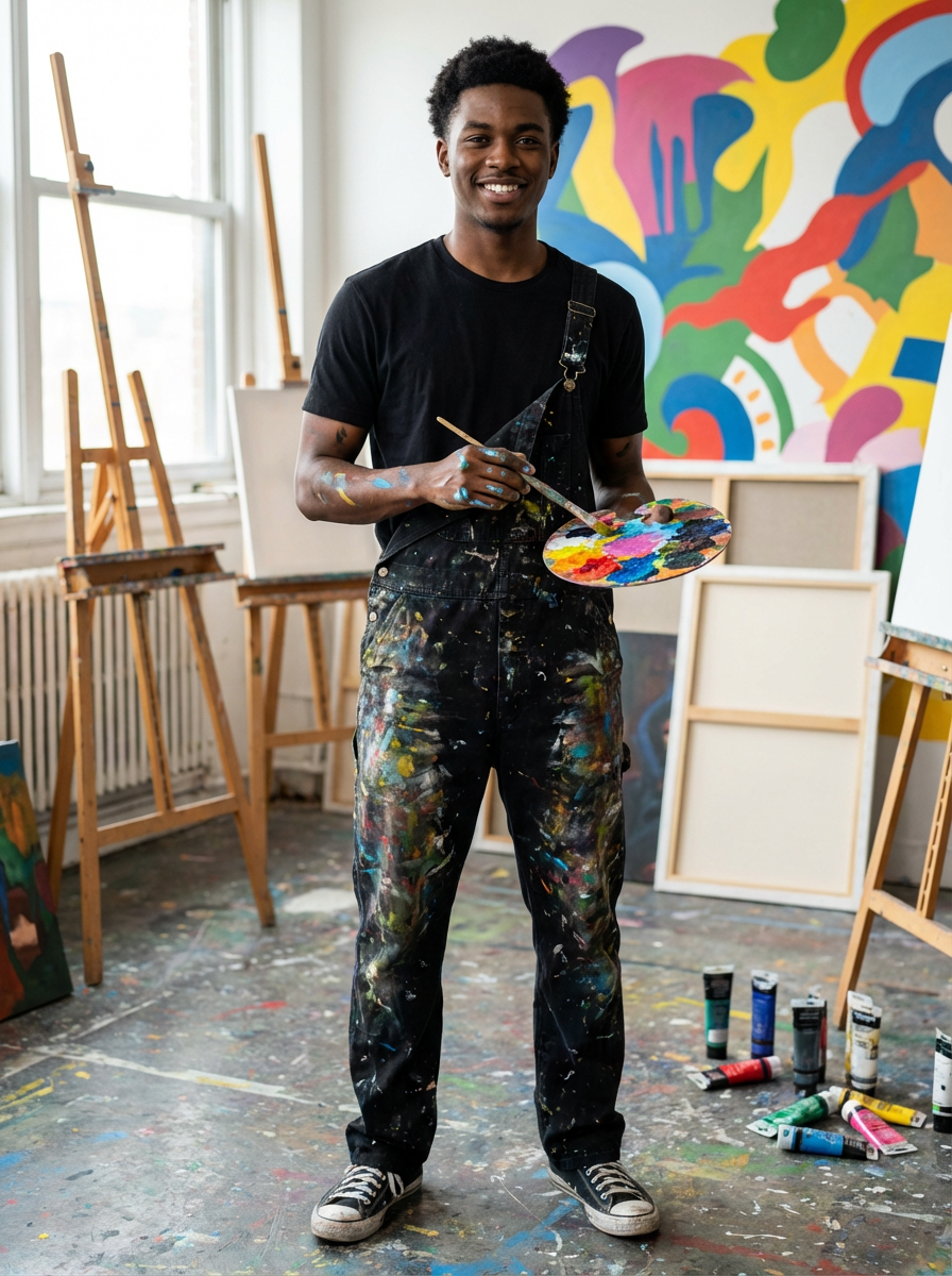 model as pop artist, colorful vibrant style, energetic expression, modern studio setting