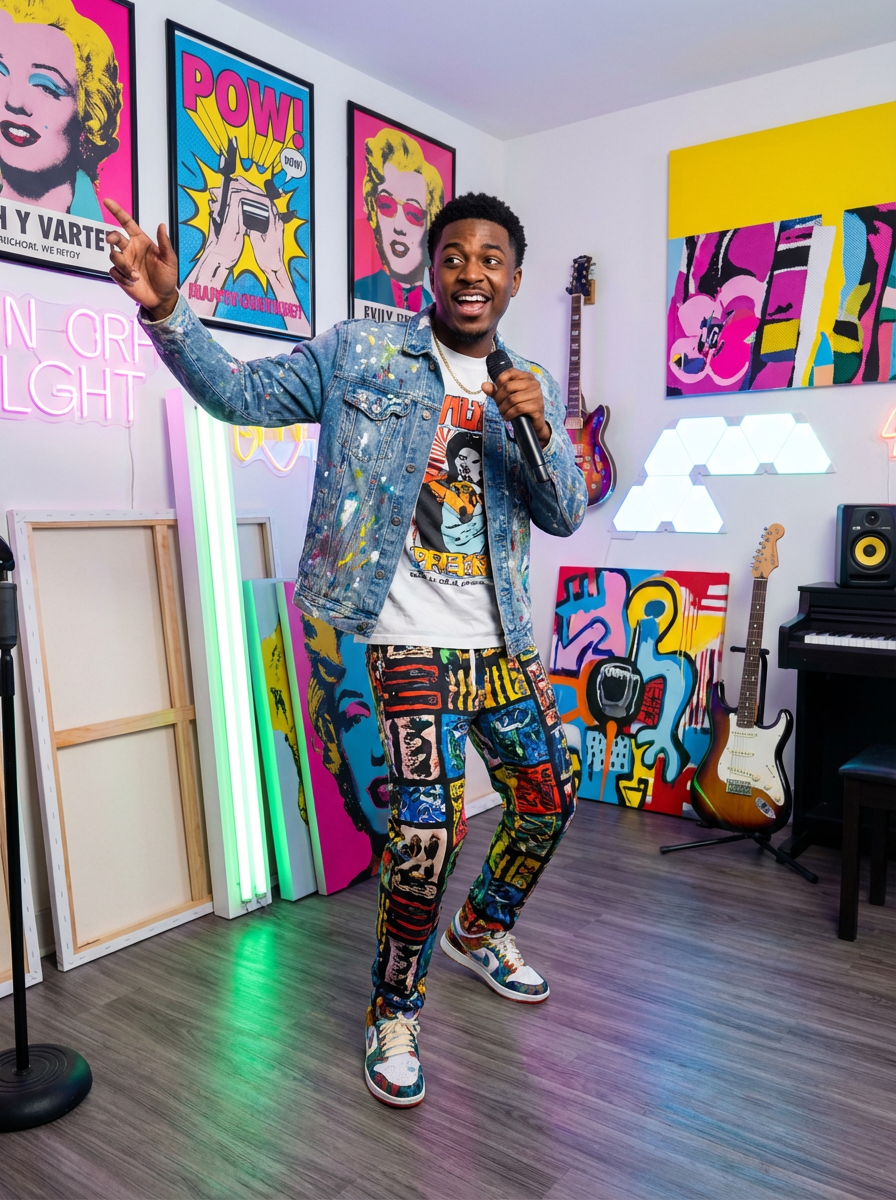 model as pop artist, colorful vibrant style, energetic expression, modern studio setting