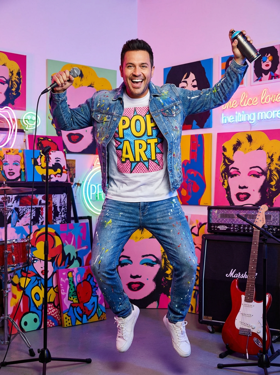model as pop artist, colorful vibrant style, energetic expression, modern studio setting