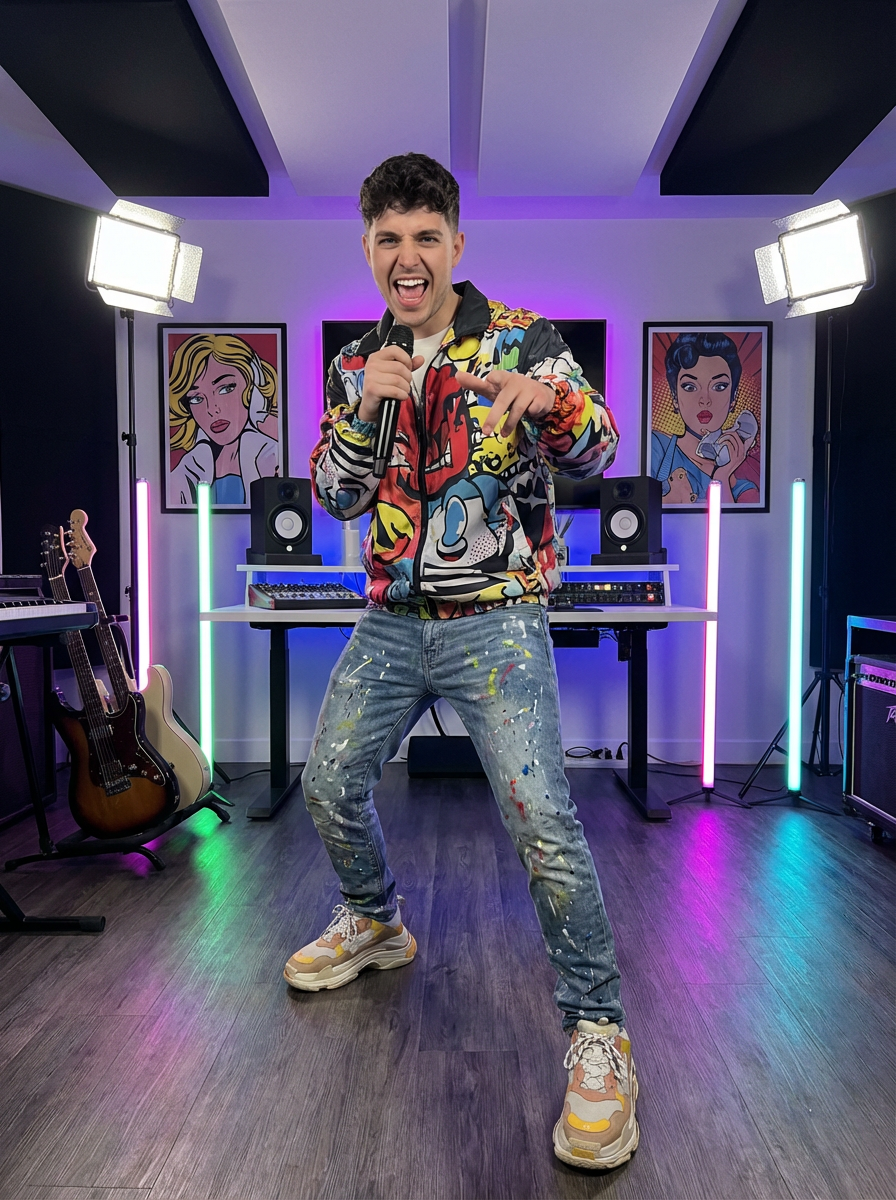 model as pop artist, colorful vibrant style, energetic expression, modern studio setting