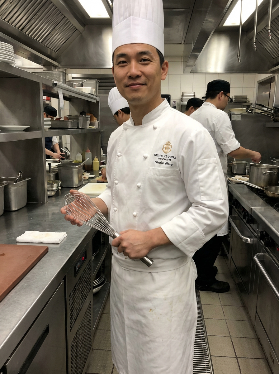model as professional chef, crisp white chef coat and toque, confident culinary expert expression, commercial kitchen background