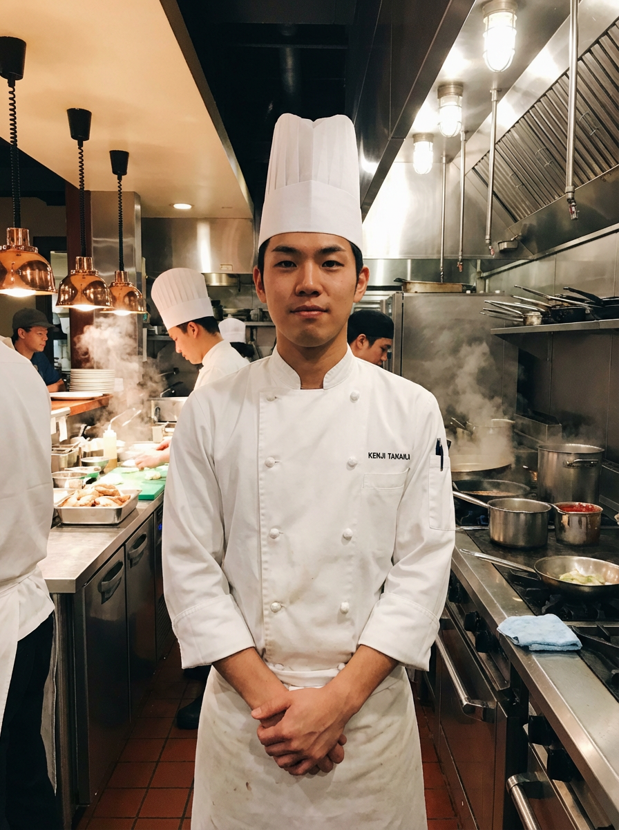 model as professional chef, crisp white chef coat and toque, confident culinary expert expression, commercial kitchen background