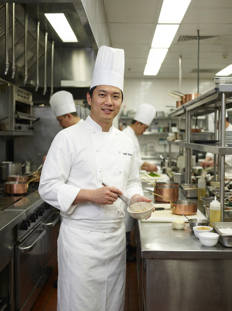 model as professional chef, crisp white chef coat and toque, confident culinary expert expression, commercial kitchen background