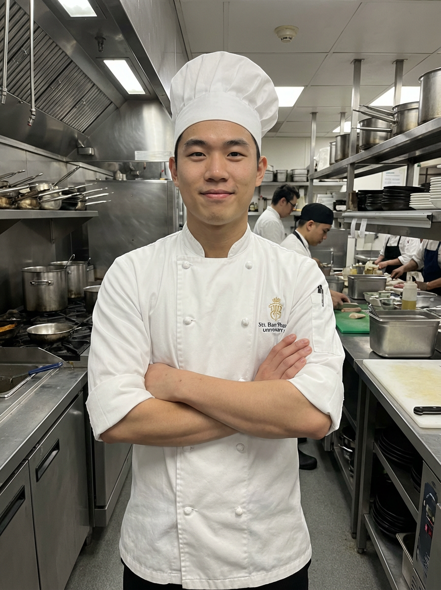 model as professional chef, crisp white chef coat and toque, confident culinary expert expression, commercial kitchen background