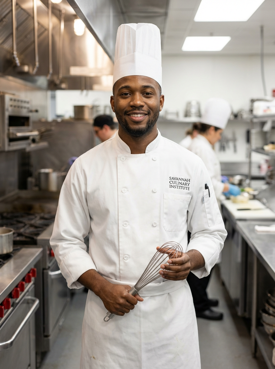 model as professional chef, crisp white chef coat and toque, confident culinary expert expression, commercial kitchen background