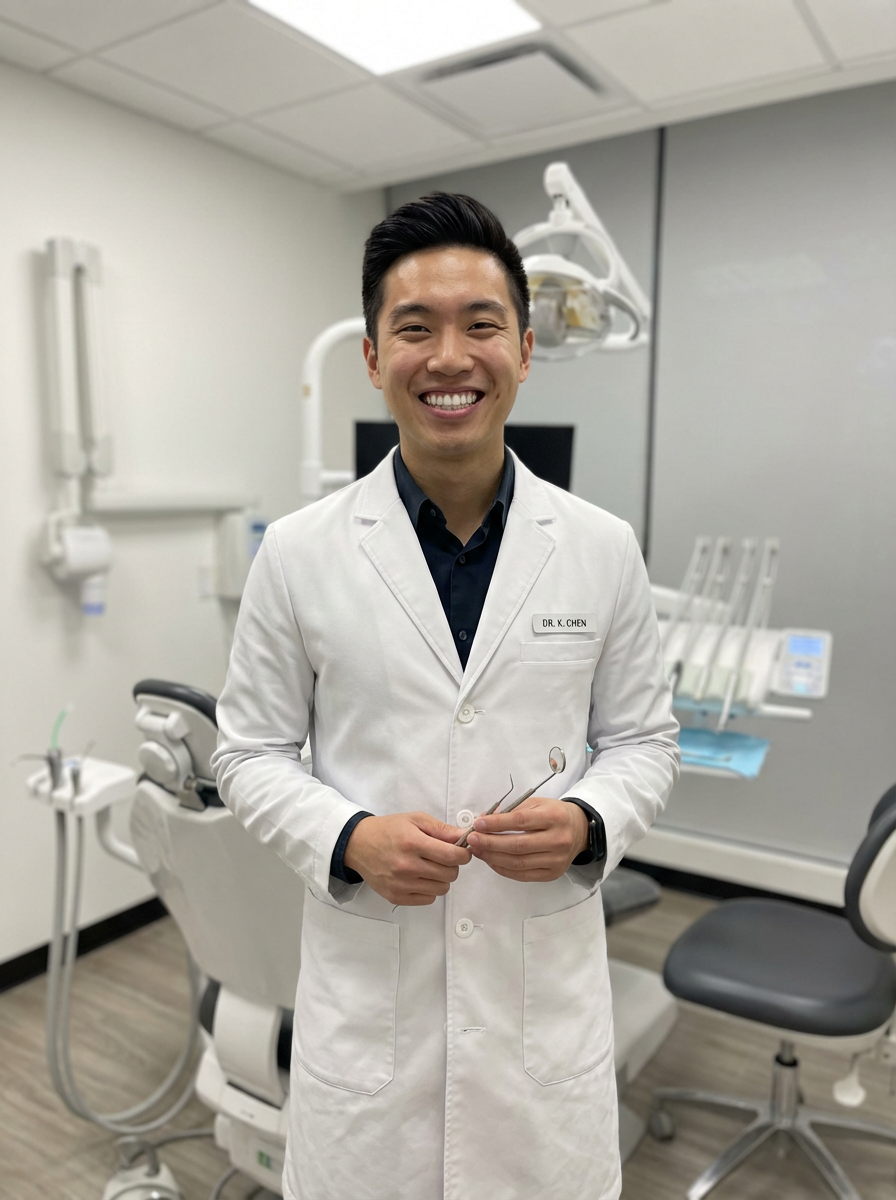 model as professional dentist, white dental coat, perfect smile showing healthy teeth, modern dental office background
