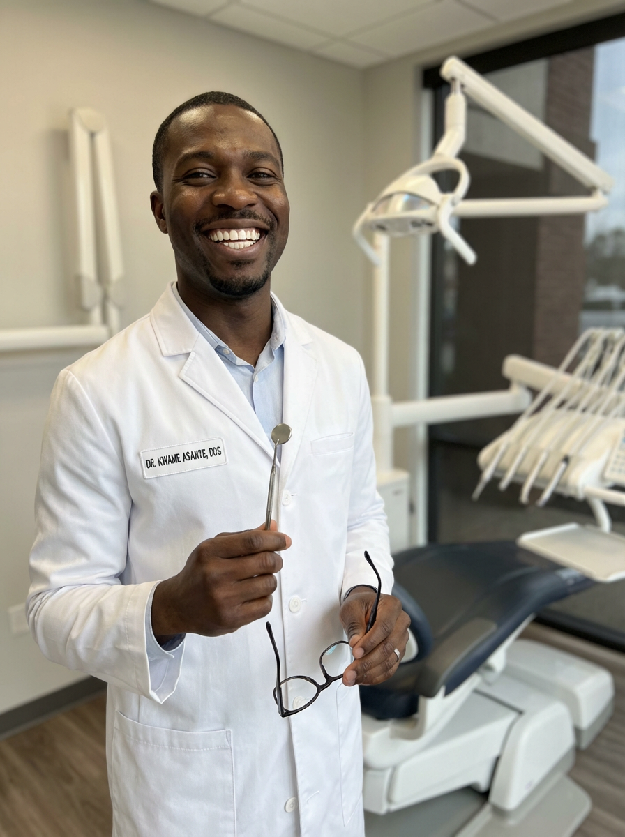model as professional dentist, white dental coat, perfect smile showing healthy teeth, modern dental office background
