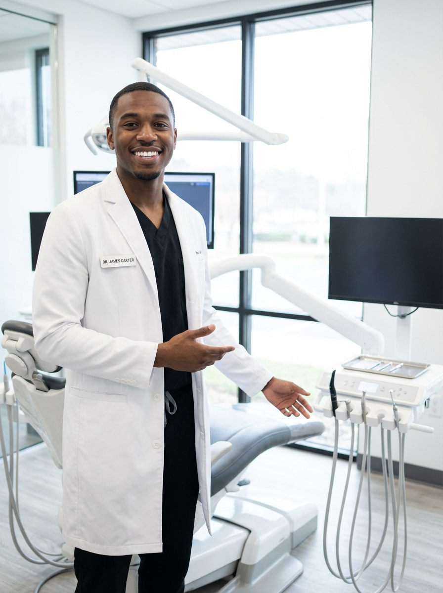 model as professional dentist, white dental coat, perfect smile showing healthy teeth, modern dental office background