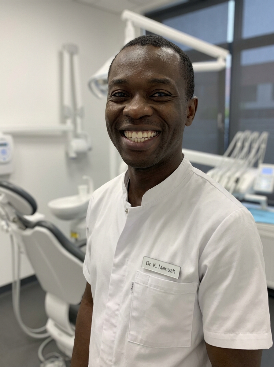 model as professional dentist, white dental coat, perfect smile showing healthy teeth, modern dental office background