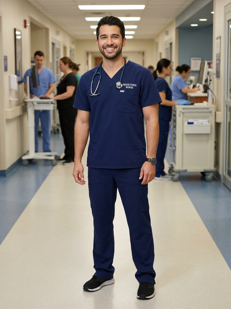 model as professional nurse, wearing clean scrubs, friendly approachable smile, hospital setting background, professional lighting