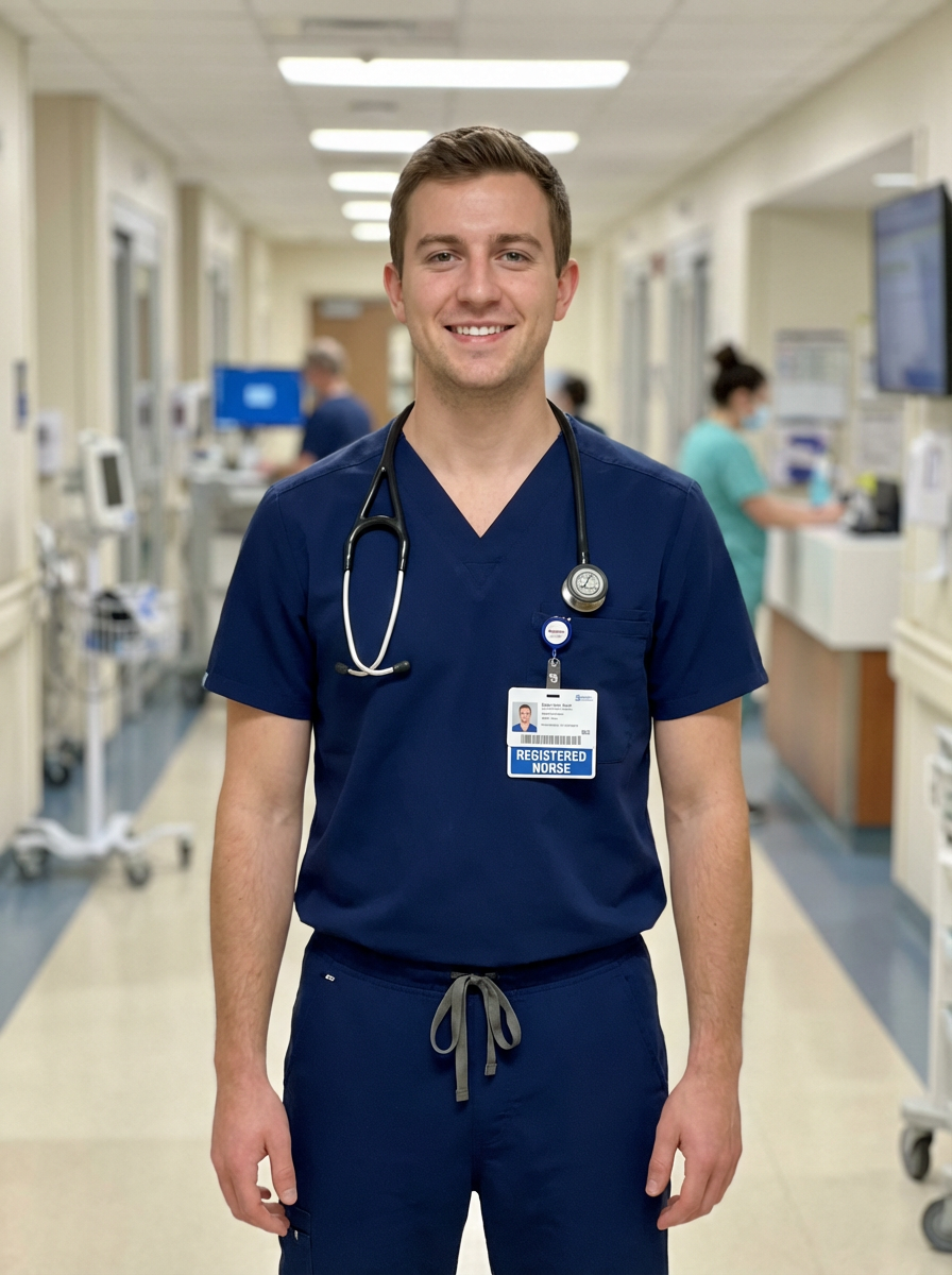 model as professional nurse, wearing clean scrubs, friendly approachable smile, hospital setting background, professional lighting