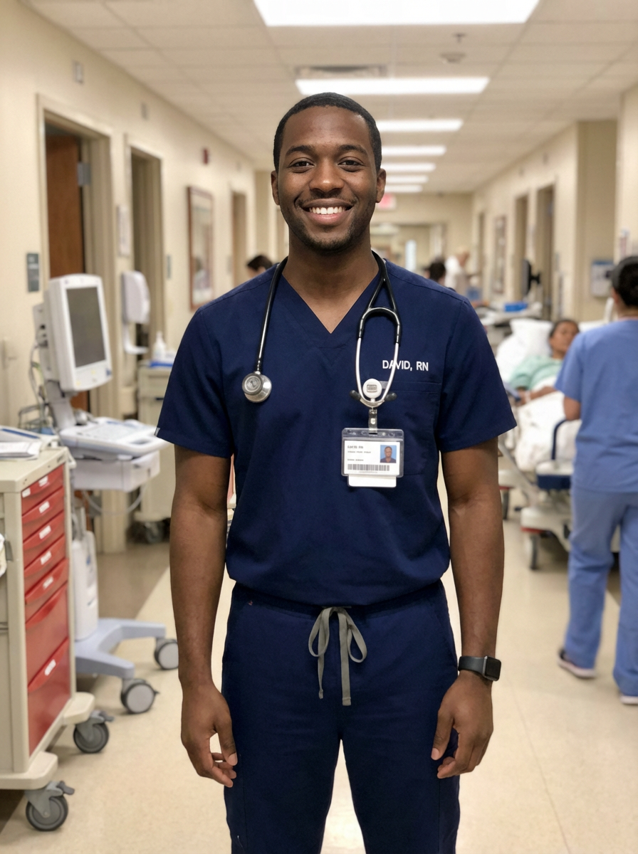 model as professional nurse, wearing clean scrubs, friendly approachable smile, hospital setting background, professional lighting