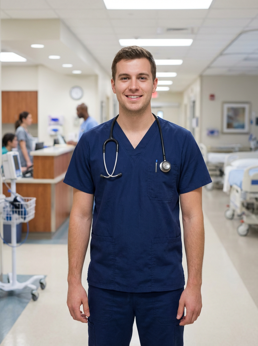 model as professional nurse, wearing clean scrubs, friendly approachable smile, hospital setting background, professional lighting