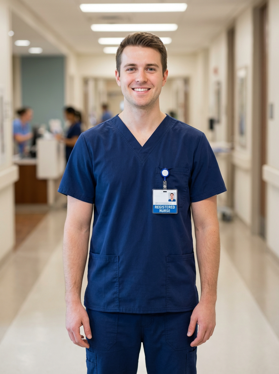 model as registered nurse, professional headshot, clean pressed scrubs, hospital corridor background, trustworthy expression