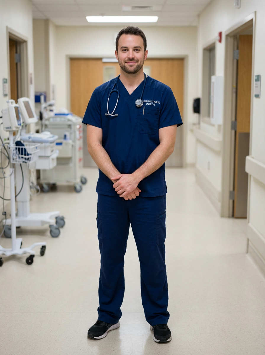 model as registered nurse, professional headshot, clean pressed scrubs, hospital corridor background, trustworthy expression