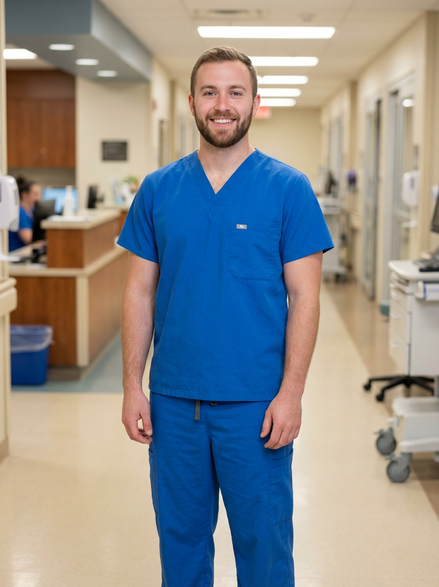 model as registered nurse, professional headshot, clean pressed scrubs, hospital corridor background, trustworthy expression