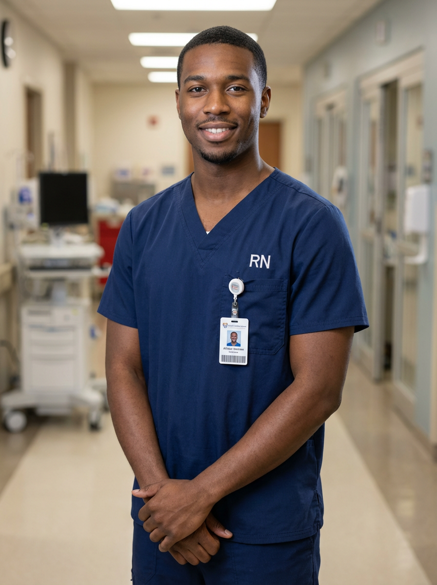 model as registered nurse, professional headshot, clean pressed scrubs, hospital corridor background, trustworthy expression