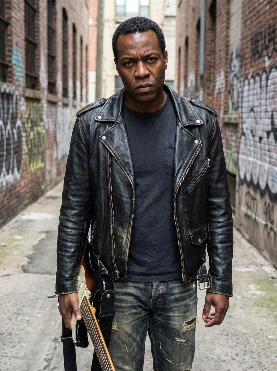 model as rock musician, edgy leather jacket, intense artistic expression, gritty urban background