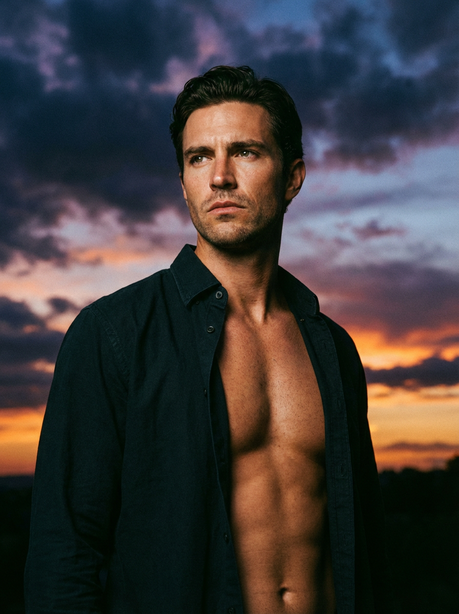 model as romance novel cover, open shirt, brooding look, dramatic sky backdrop, passionate aesthetic
