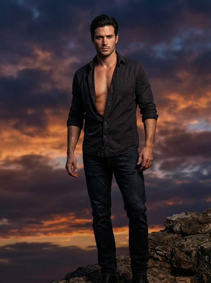 model as romance novel cover, open shirt, brooding look, dramatic sky backdrop, passionate aesthetic
