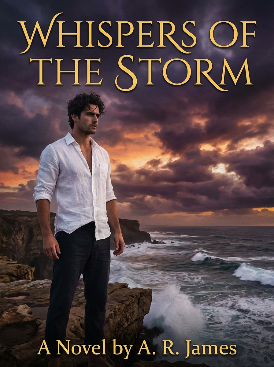 model as romance novel cover, open shirt, brooding look, dramatic sky backdrop, passionate aesthetic